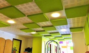 Afin de limiter le phénomène d’écho qui se produirait dans une salle non traitée et qui amplifierait le moindre bruit émis (conversations, bruits de chaises, bruits de pas…), il est nécessaire de mettre en place des panneaux acoustiques en plafond et sur les murs