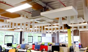 Les bureaux open-space sont des espaces conviviaux dans lesquels le niveau sonore peut être dérangeant. La correction acoustique a pour but de limiter ou supprimer tous les phénomènes « d’écho » ou de réverbération et d’améliorer au maximum la décroissance spatiale, ce faisant les conversations seront plus douces, chaque interlocuteur pouvant dialoguer facilement.