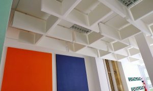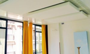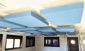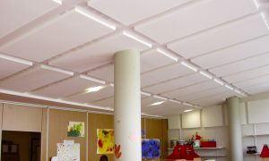 Il est alors possible de suspendre des capteurs (panneaux suspendus à l’horizontale) ou des baffles (suspension verticale) en fonction de la hauteur sous plafond disponible et de la nature du plafond. Pour les plafonds chauffants la mise en place de baffles est préférable.