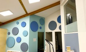 Afin de diminuer les réverbérations de murs à murs particulièrement sensibles dans ces lieux de vie accueillant un très jeune public, nous préconisons la mise en place de panneaux acoustiques résistants mécaniquement.