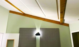 Les produits de la gamme ambiance sont collés directement contre le plafond à l’aide d’une colle sans solvant ni COV le tout classé au feu M1.