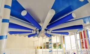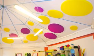 Pour les plafonds bas ou les plafonds susceptibles de recevoir des chocs (jeu de ballons), la mise en place de panneaux Acoustic Panel 2V Blue Equilibre Classic, Color, Picture ou Design est conseillée.