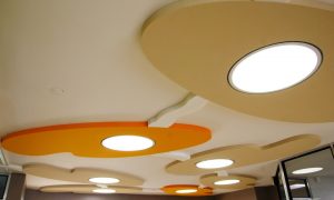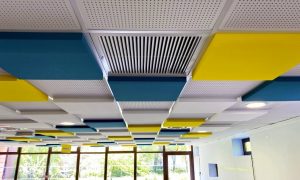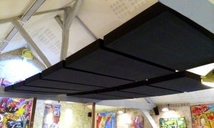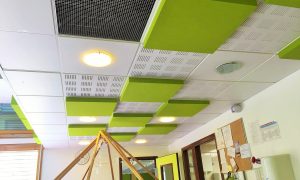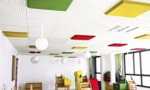 Dans le cas d’un faux plafond ossature apparente, il est possible de changer une certaine quantité de dalles par d’autres avec un pouvoir d’absorption bien supérieur comme les dalles absorbantes :