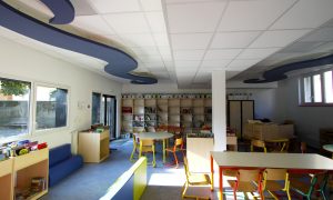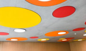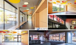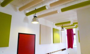 Dans les locaux d’enseignement, Il faut traiter impérativement le plafond, plusieurs solutions sont envisageables. Des panneaux acoustiques muraux peuvent aussi être mis en place en complément afin d’améliorer l’intelligibilité des échanges.